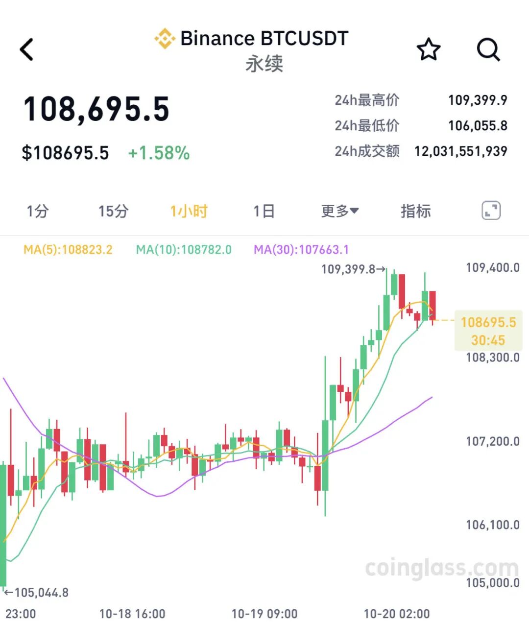 10月20日,加密货币市场全线大涨,比特币走强,截至发稿,比特币上涨1.58%,报108695.5美元。