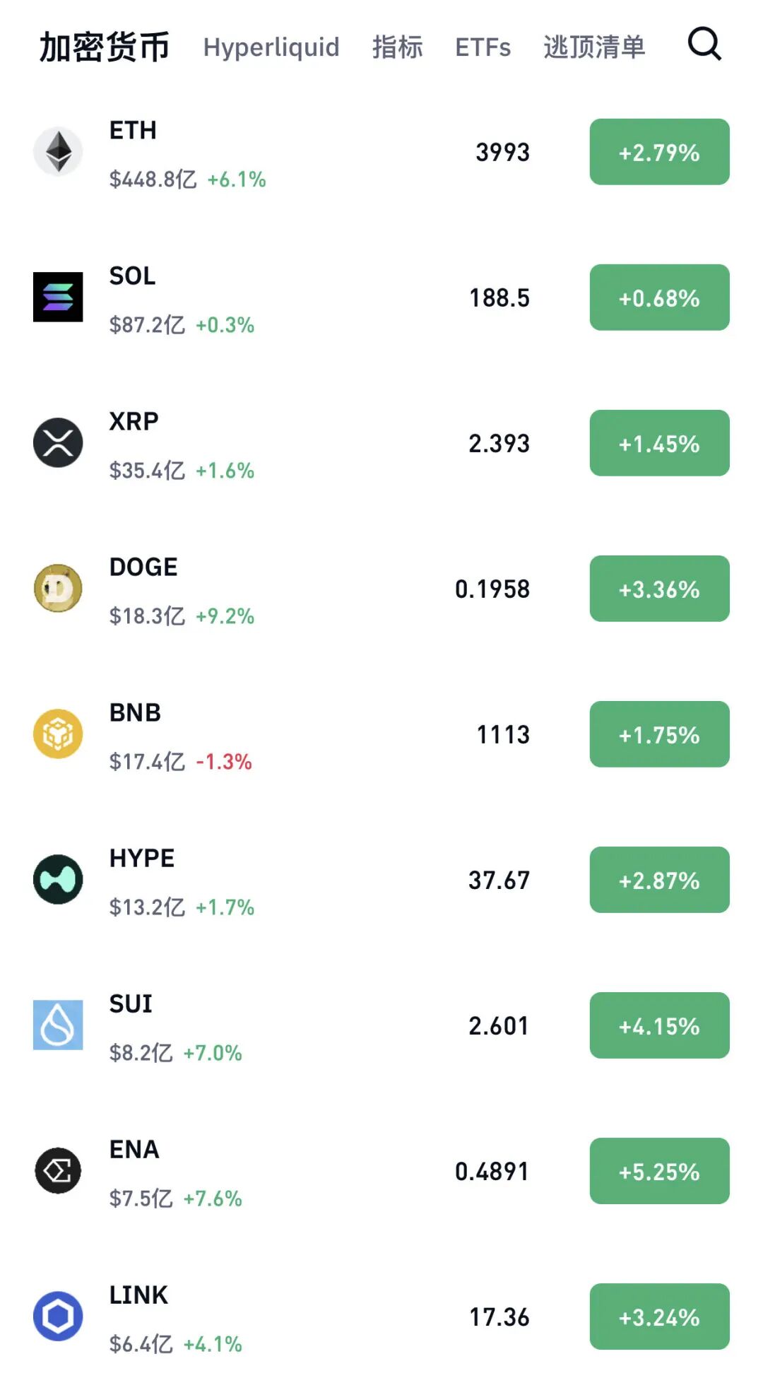 除了比特币,以太坊上涨2.79%,狗狗币上涨3.36%,SUI币上涨4.15%,ENA币上涨5.25%。
