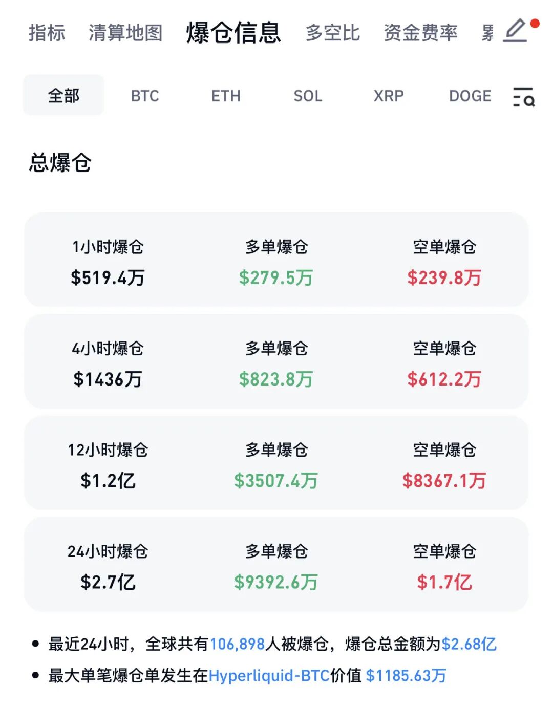 CoinGlass显示,近24小时,全球共有超10万人爆仓,爆仓总金额为2.68亿美元。其中,最大单笔爆仓单发生在Hyperliquid-BTC,价值1185.63万美元。