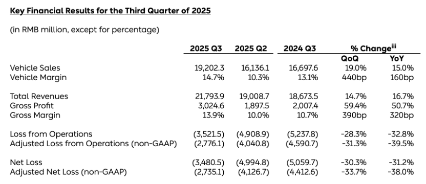 11月25日,蔚来发布的2025年三季度财报显示,公司第三季度实现营收217.9亿元,同比增长16.7%,环比增长14.7%,创历史新高;第三季度净亏损为34.81亿元,同比收窄31.2%;经调整净亏损为27.35亿元,同比收窄38%;三季度现金储备367亿元,较上季度末增长近百亿元。