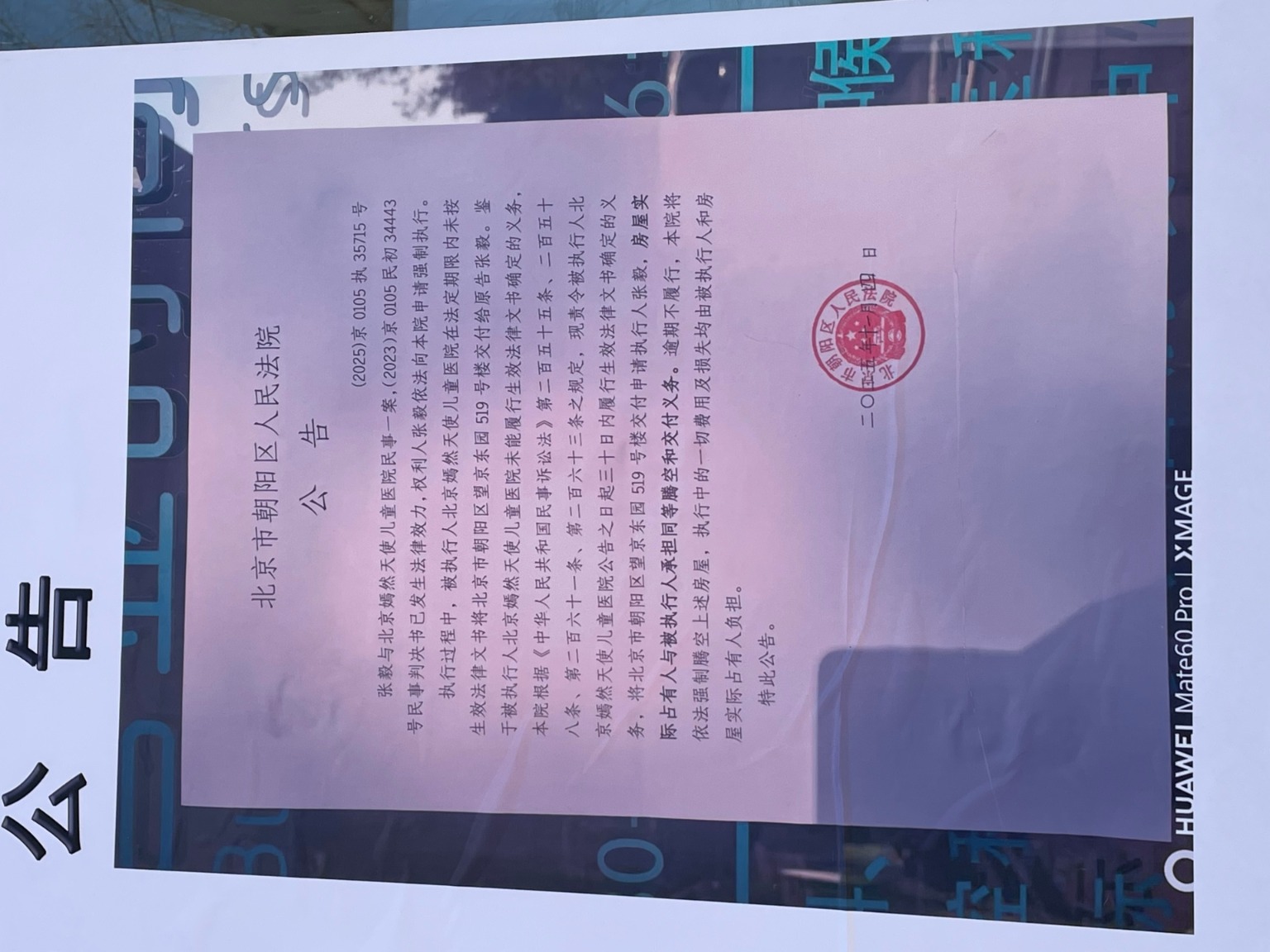 执行过程中,被执行人嫣然医院在法定期限内未按生效法律文书将北京市朝阳区望京东园519号楼交付给原告张毅,现责令被执行人嫣然医院公告之日(2025年11月4日)起三十日内履行生效法律文书确定的义务,将北京市朝阳区望京东园519号楼交付申请执行人张毅,房屋实际占有人与被执行人承担同等腾空和交付义务。逾期不履行,法院将依法强制腾空上述房屋。