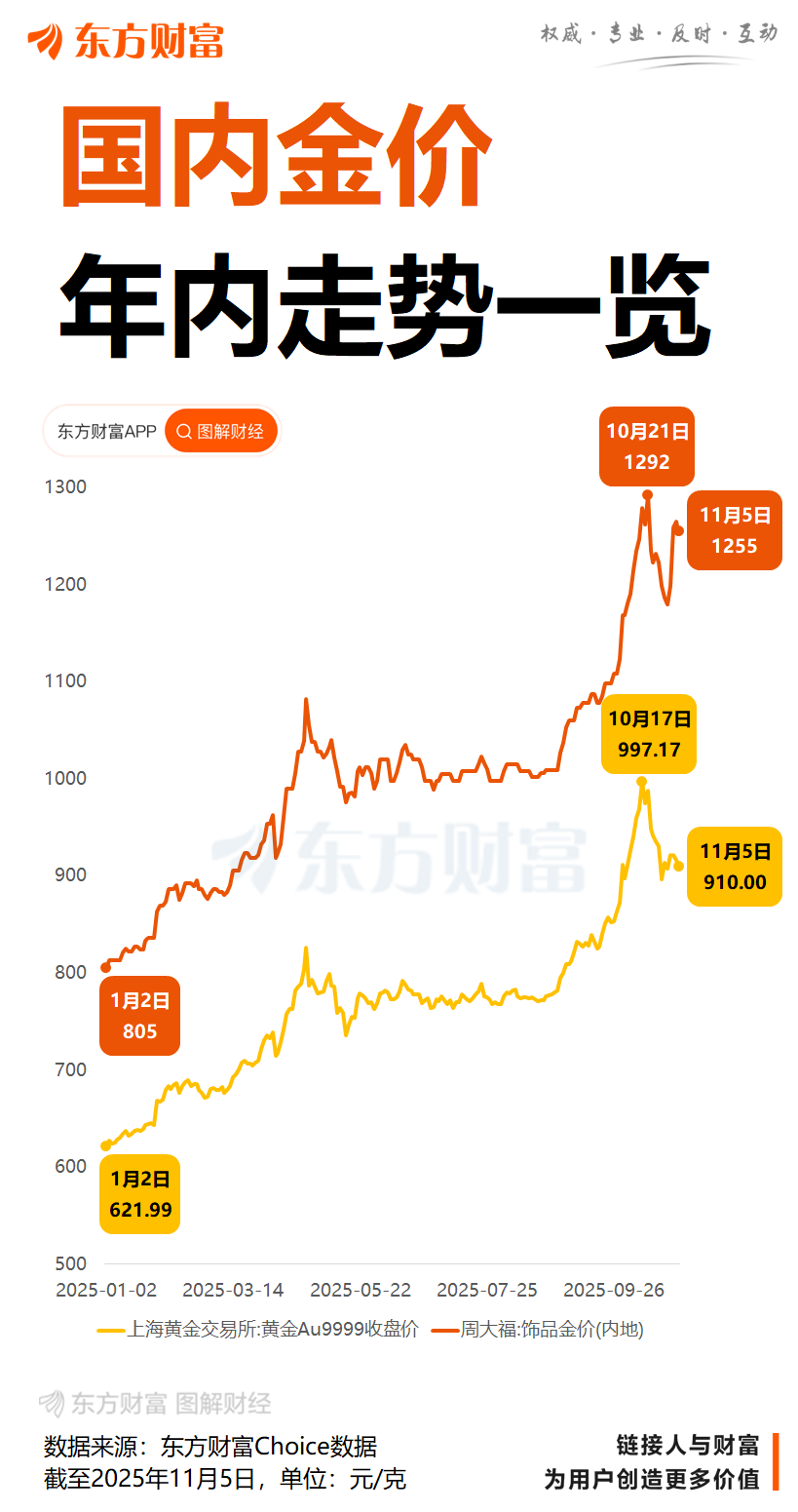 市场对新政反应迅速。界面新闻记者近日走访了深圳水贝市场以及部分品牌门店,发现金价近两日普遍上涨了60多元每克。周大福11月1日报1198元/克,11月3日报1259元/克,11月4日报1265元/克,11月5日回落至1255元/克。水贝市场亦从11月1日的931元/克上涨至11月4日的991元/克。