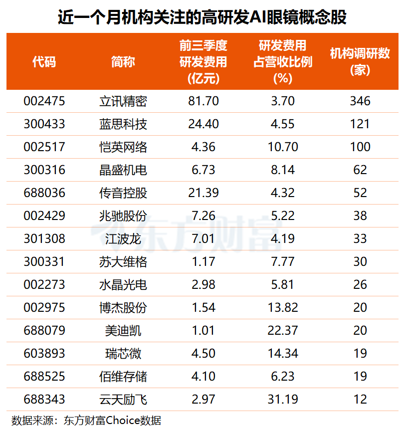东方财富Choice数据显示,上述65只高研发AI眼镜概念股中,共有8股近一个月获得机构密集调研,其中,消费电子龙头立讯精密获346家机构集中调研,蓝思科技、恺英网络机构调研数分别为121家和100家,晶盛机电、传音控股近一个月均获超50家机构前往调研。